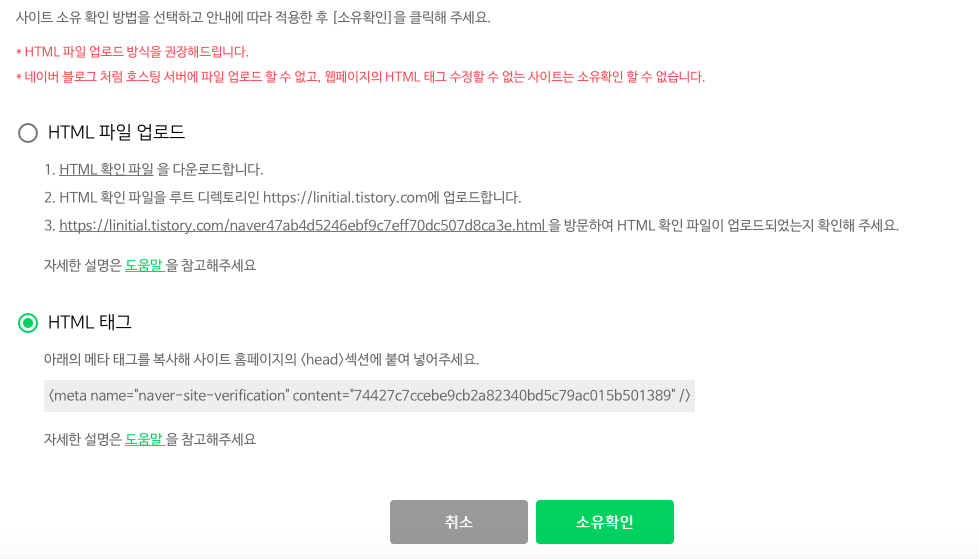 사이트 소유 확인에 관련된 옵션을 선택할 수 있는 화면이 나옵니다.