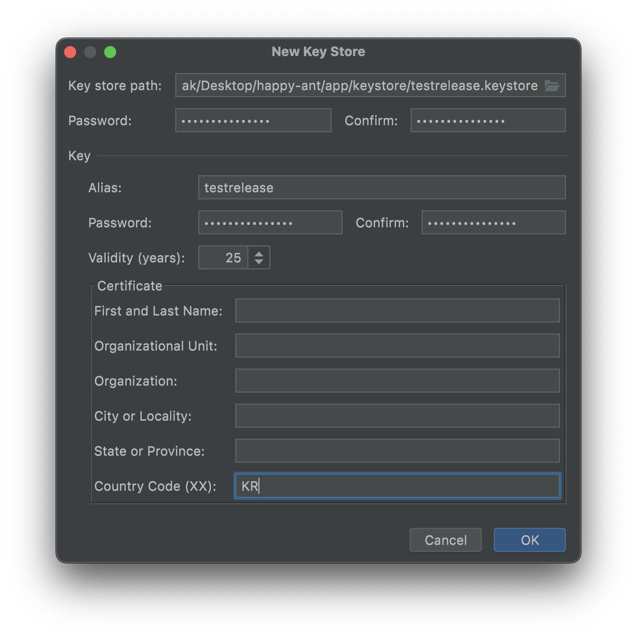 이제 Cancel 을 누르고 keystore 가 생성될 경로로 잡았던 폴더에