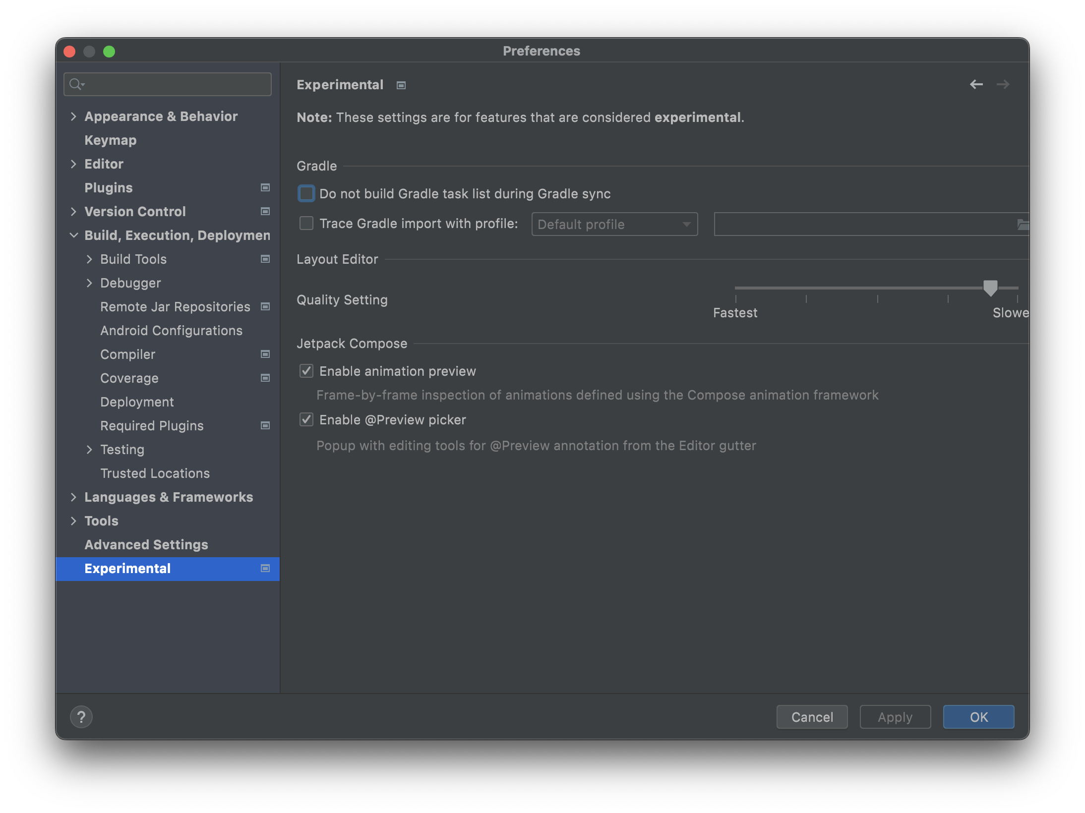 그 후 Do not build Gradle Task list during Gradle sync 라는 옵션에 체크가 되어있는지 확인하고