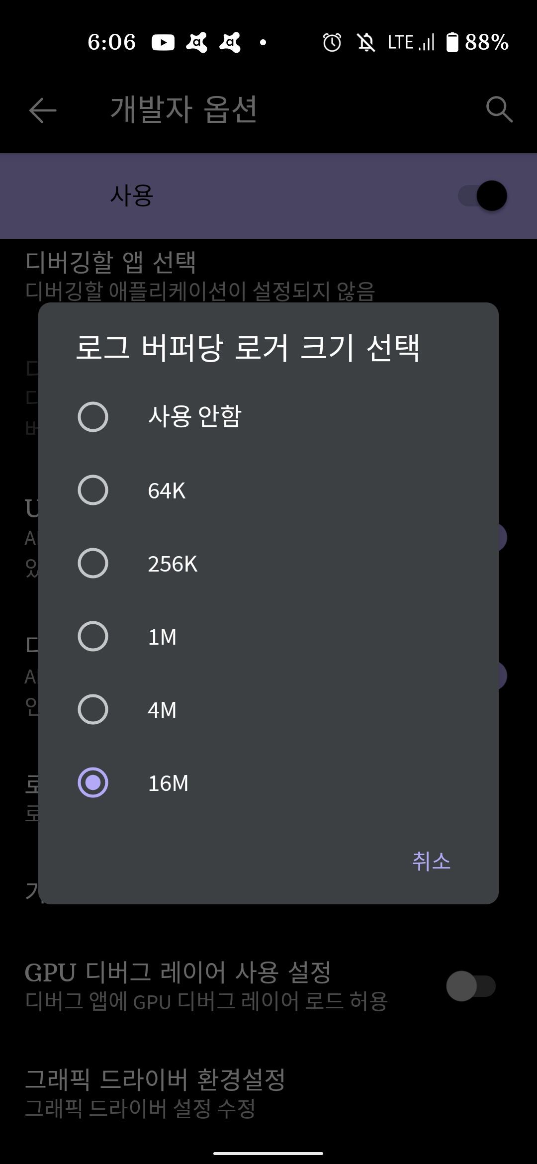 로거 버퍼당 로거 크기 설정 변경 후 logcat 을 재시작하거나