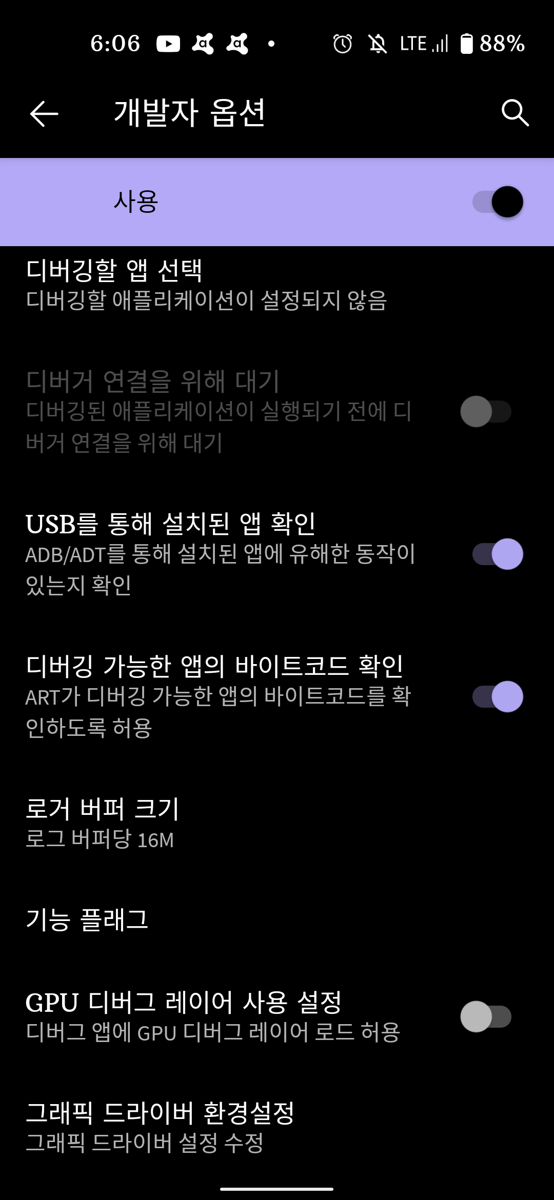 설정 -> 개발자옵션으로 이동.