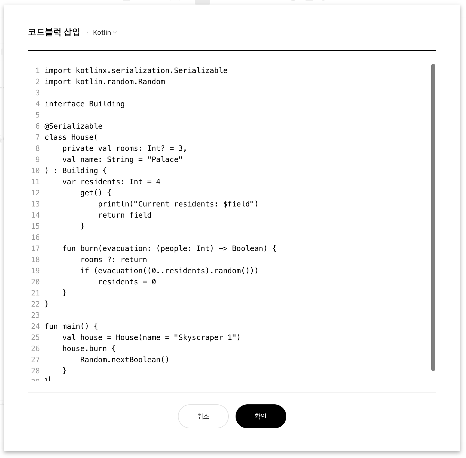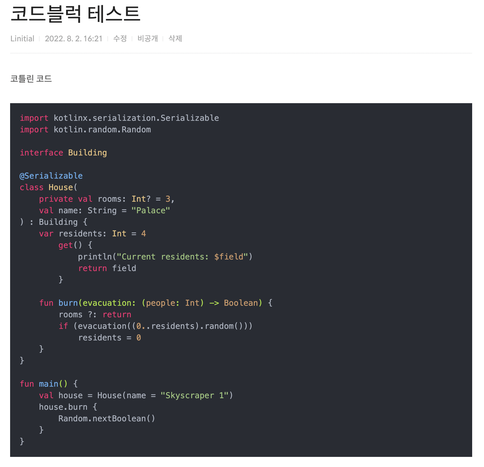 테스트용으로 Kotlin 코드 블럭이 들어간 글을 하나 써보겠습니다