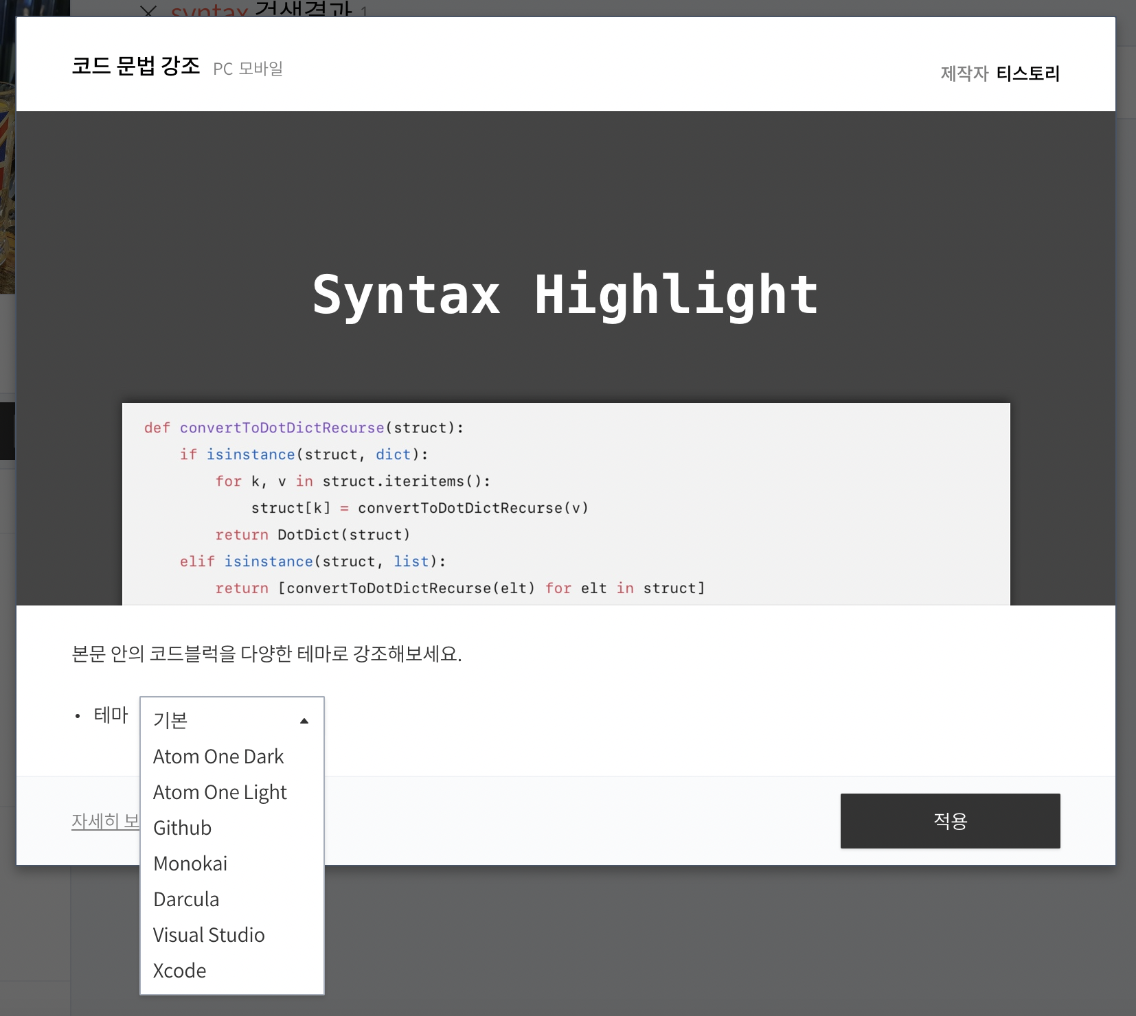 여기서 적용하고 싶은 코드 테마를 선택하시고