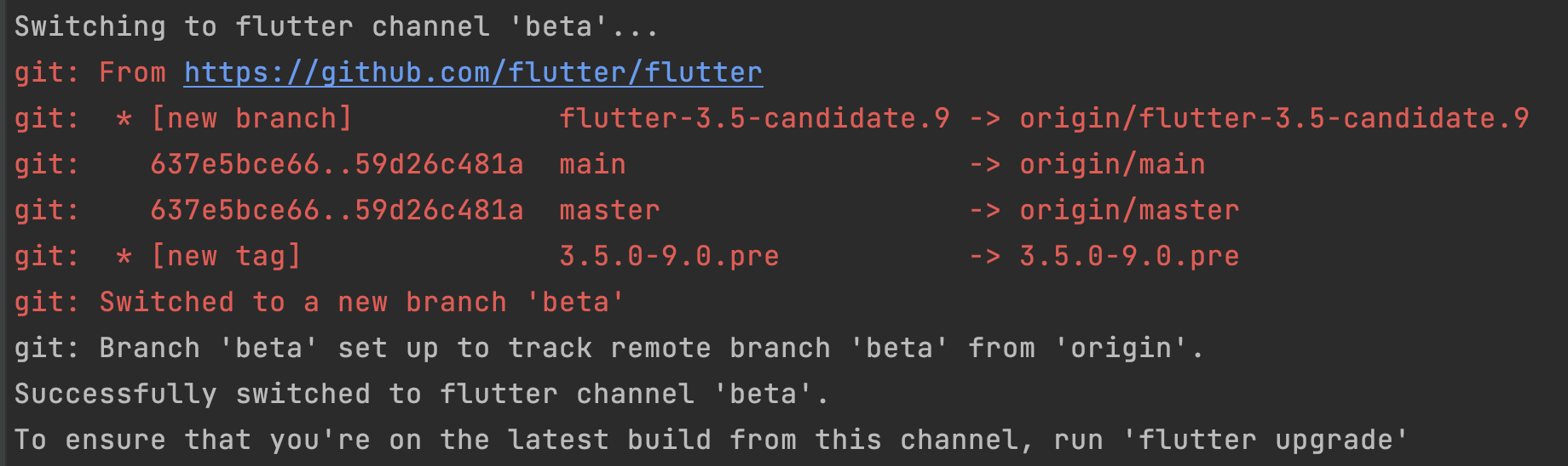 channel 확인을 위해 flutter channel 이라고 다시 입력할 경우 곧바로 변경된 채널로 SDK 가 업그레이드 되니