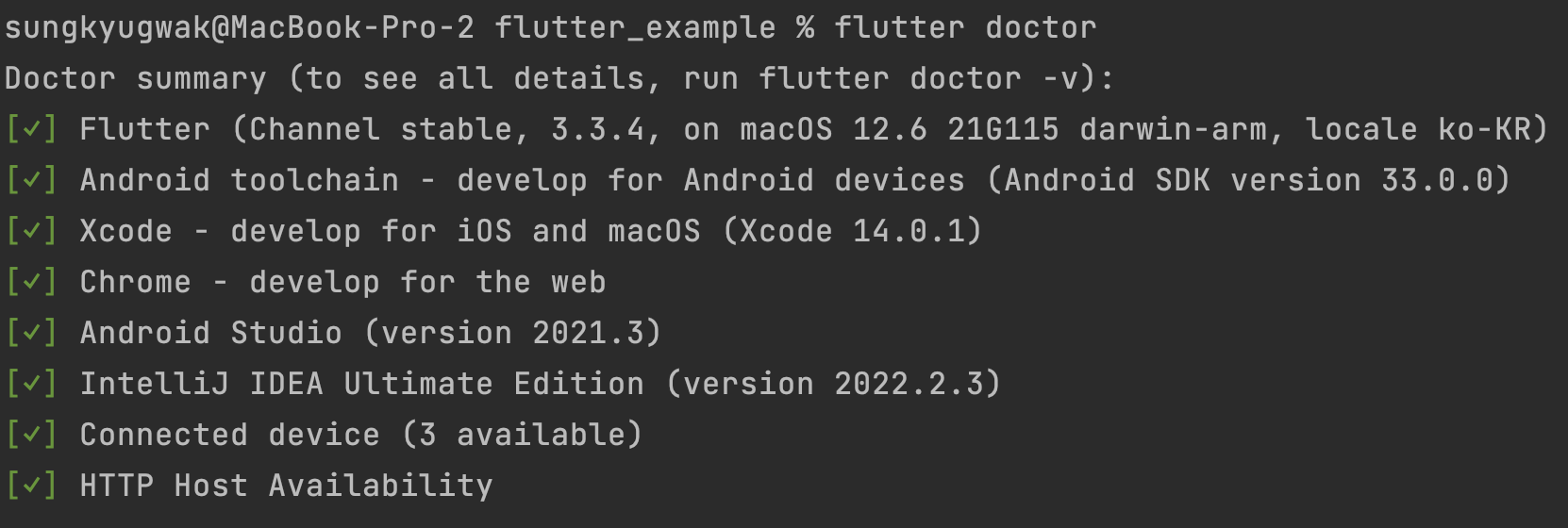 현재 flutter sdk 를 사용하기 위해서 어떤 추가적인 세팅이 남았는지 flutter doctor 가 확인해줍니다.